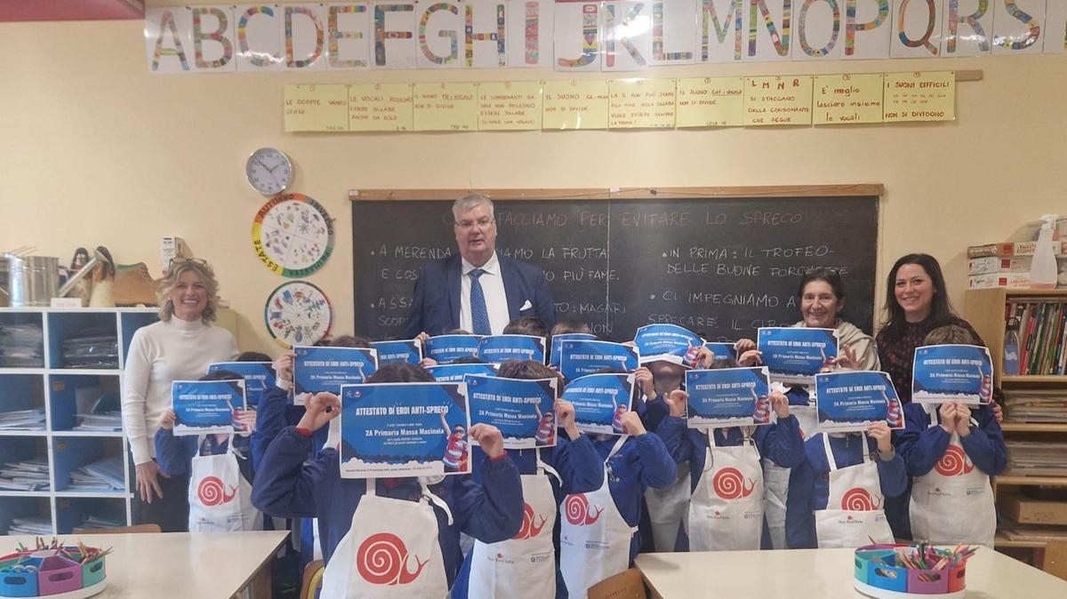 E’ la classe seconda della scuola primaria di Massa Macinaia la classe delle scuole capannoresi risultata più virtuosa a mensa, per aver sprecato meno cibo. La classe è stata premiata  nella sede scolastica alla presenza dell’assessora alle politiche educative Silvia Sarti, di Franco Del Carria responsabile del centro cottura di Capannori presente insieme e di Giovanna Meduri, dietista e referente Area Qualità, ricevendo l’attestato di ‘Eroi antispreco’ ed un piccolo premio come riconoscimento per l’impegno e la preziosa collaborazione nella lotta allo spreco del cibo.