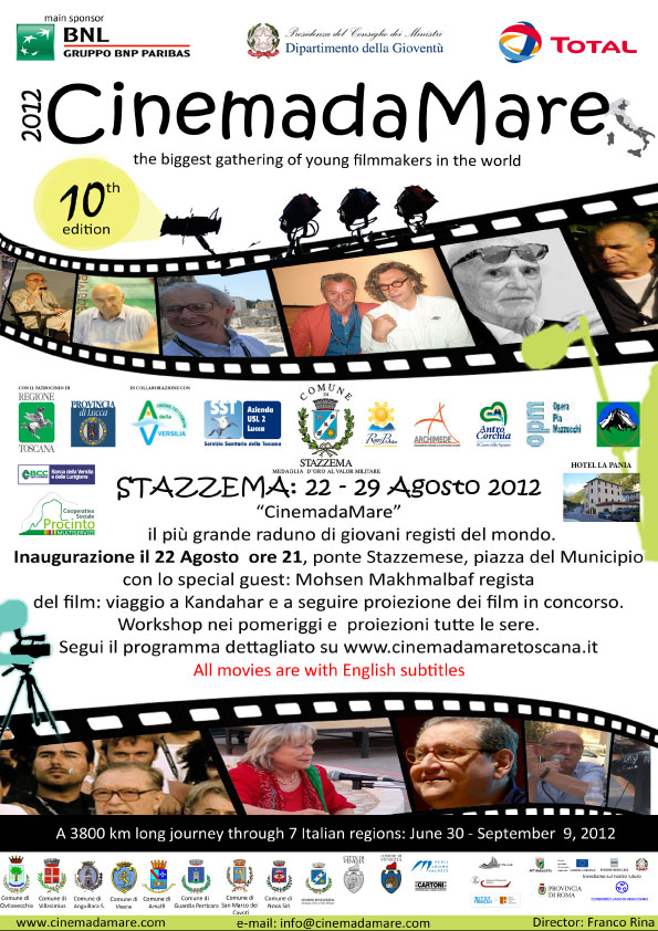 L’ Alta Versilia con i paesi e le frazioni del suo territorio, diventerà un set a cielo aperto, con cineasti da tutto il mondo che potranno “approfittare” degli scenari di indiscutibile bellezza per girare i propri cortometraggi. Il concorso cinematografico, oltre ad una competizione settimanale per tutti i film prodotti durante il Festival, prevede inoltre, ogni sera, a seguire, la proiezione dei film in concorso con la possibilità per il pubblico di confrontarsi direttamente con i registi dei film o con gli attori protagonisti. Ospite d’onore della rassegna, durante la tappa di Stazzema , sarà il cineasta iraniano Moshen Makhmalbaf che presenterà al pubblico i suoi due lungometraggi: “Viaggio a Kandahar” e “Viaggio in India” e Francesco Bruni con “Scialla”. La partecipazione alle attività della rassegna, è totalmente gratuita e sarà possibile prendere parte ogni giorno (dalle 17.00 alle 19.00) a workshop e lezioni di cinema tenuti dagli ospiti della manifestazione.