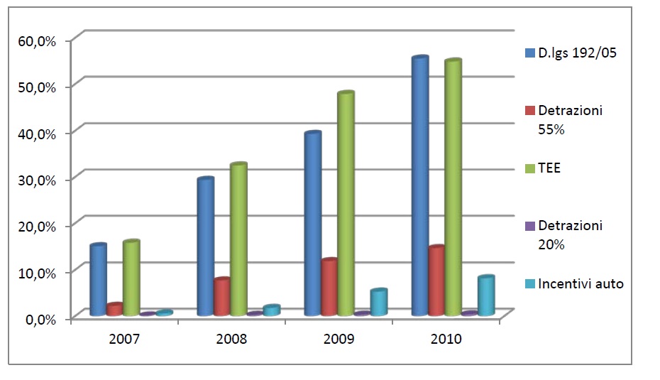 Più delle parole parlano i grafici del rapporto. Questo qui sotto mostra l’efficacia dei diversi strumenti: gli standard minimi di prestazioni energetiche negli edifici (D.lgs 192/95), le detrazioni fiscali del 55%, i certificati bianchi (TEE) e gli incentivi per l’acquisto di auto meno inquinanti.
