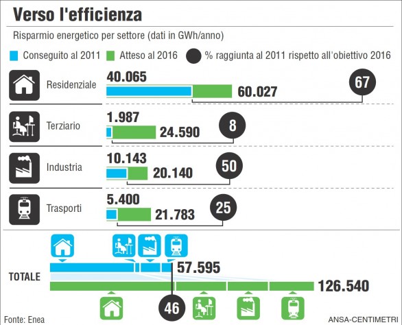 Il risparmio di energia primaria conseguito nel 2014 è stato pari a 2,7 milioni di TEP (Tonnellate Equivalenti di Petrolio) contro i 2,5 milioni dell’anno precedente. Ed il 54% dei TEE è collegato a risparmi ottenuti mediante la riduzione dei consumi del gas, il 26% di energia elettrica ed il 20% per risparmi di altra natura.