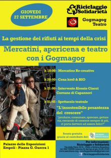 Mercatini, apericena e teatro con i Gogmagog. Si chiuderanno così, con una serata evento, i progetti Re-creative days e T-shoppers, curati dalla cooperativa Riciclaggio e Solidarietà Firenze.