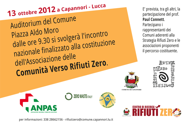 Circa cento Comuni italiani hanno aderito alla strategia ‘Rifiuti Zero’ e si ritroveranno sabato 13 ottobre a Capannori per costituire l’associazione delle ‘Comunità Verso Rifiuti Zero’. Alle 9.30 nell’auditorium di piazza Aldo Moro si svolgerà l’incontro nazionale finalizzato alla costituzione del nuovo soggetto al quale hanno già dato adesione anche numerose associazioni tra cui quella dei Comuni Virtuosi e l’Anpas. Oltre al sindaco, Giorgio Del Ghingaro, all’assessore all’ambiente Alessio Ciacci e al coordinatore del Centro di Ricerca Rifiuti Zero del Comune, Rossano Ercolini, interverrà all’incontro Paul Connett il professore americano ideatore della strategia Rifiuti Zero. All’iniziativa prenderanno parte anche esperti a livello nazionale nel settore dei rifiuti.Nel corso dell’incontro sarà approvato lo statuto della nuova associazione, programmata la sua attività a livello nazionale e nominati gli organi direttivi.