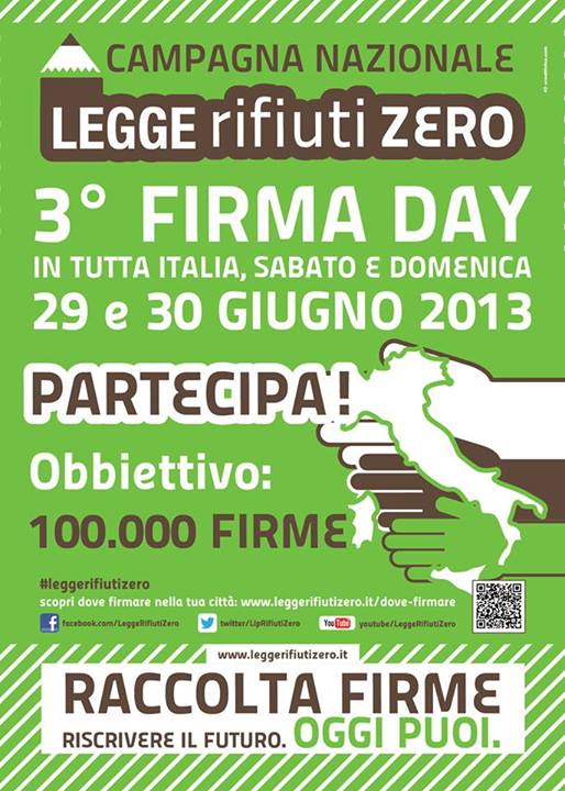 Campagna di raccolta firme per il deposito in Cassazione della Proposta di Legge nazionale Rifiuti Zero. Il 29 e 30 Giugno il Terzo Firma Day con banchetti, iniziative e convegni in tutta Italia.