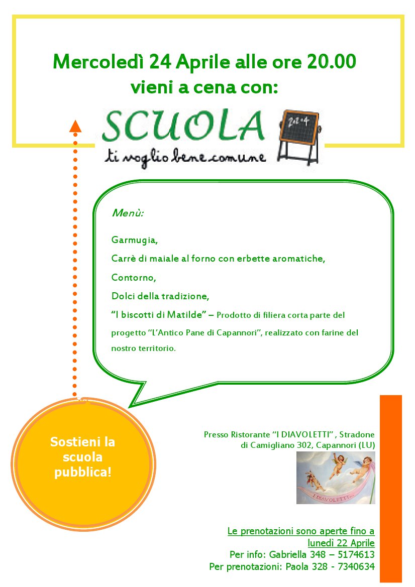 Mercoledì 20 aprile presso Ristorante “I DIAVOLETTI” , Stradone di Camigliano 302, Capannori (LU), vieni alla cena con ” SCUOLA TI VOGLIO BENE COMUNE ” !