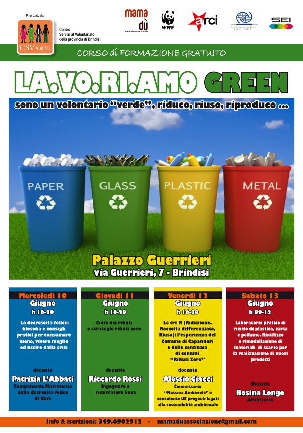 L’associazione culturale di volontariato Mamadù di Brindisi in partenariato con le associazioni: Alt …Liberi Tutti di San Pietro Vernotico, S.E.I. di Brindisi, Comitato Arci Territoriale Brindisi, Wwf Brindisi promuove un percorso formativo dal Titolo: “La.Vo.Ri.Amo Green: io sono un volontario Green, riduco, riuso, riproduco…”.